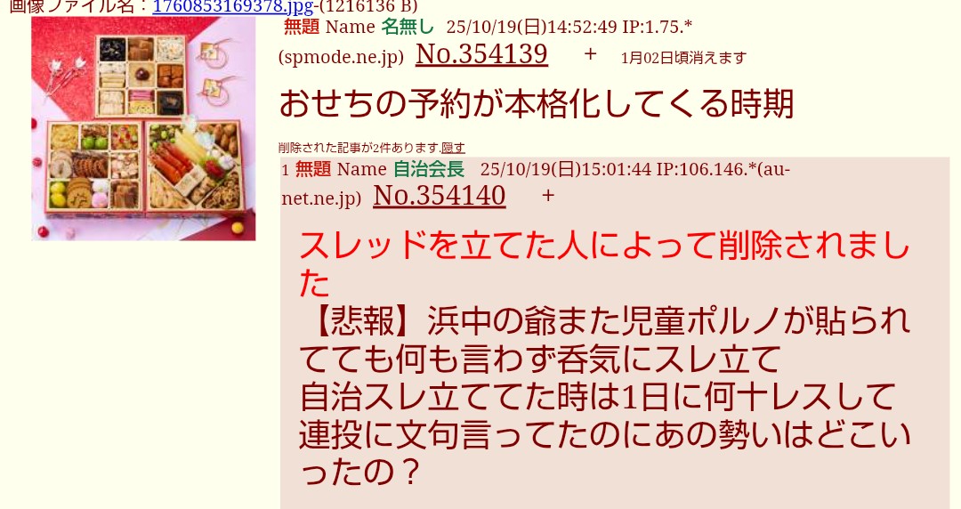 … | 2無題Name名無し 25/10/19(日)23:21:39 IP:121.109.*(dion.ne.jp)No.354149+>意味不明だからコピペ荒らしかと思って削除したけど誰かと混同してたのか |