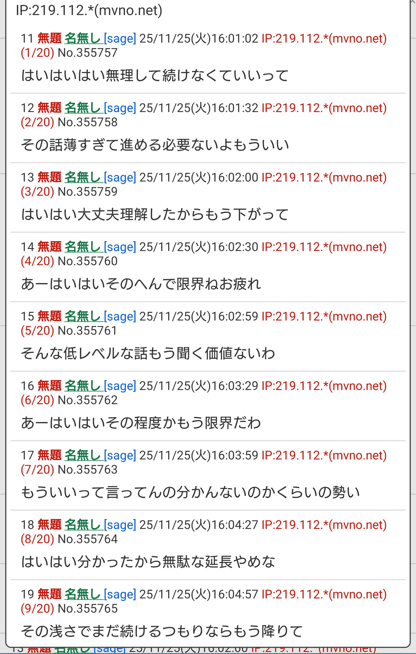 | … | 29無題Name名無し 25/11/26(水)08:47:45 IP:219.112.*(mvno.net)No.355900そうだねx1はいはい お疲れさま |