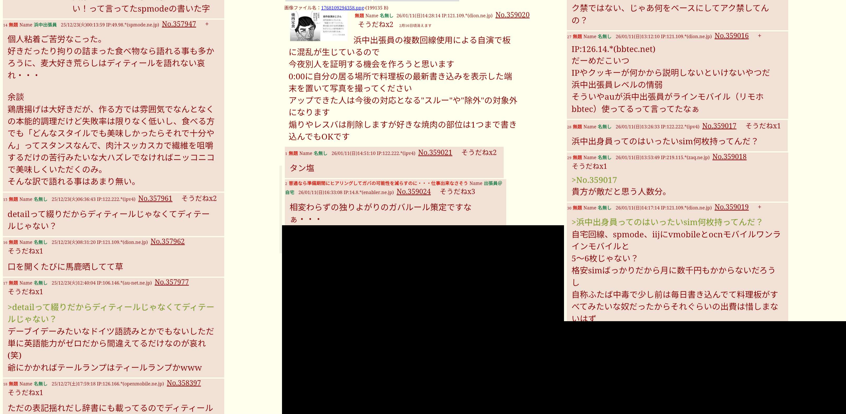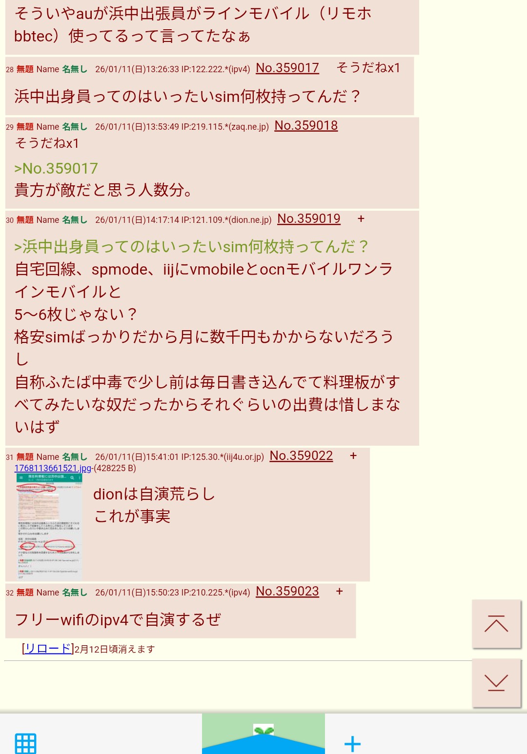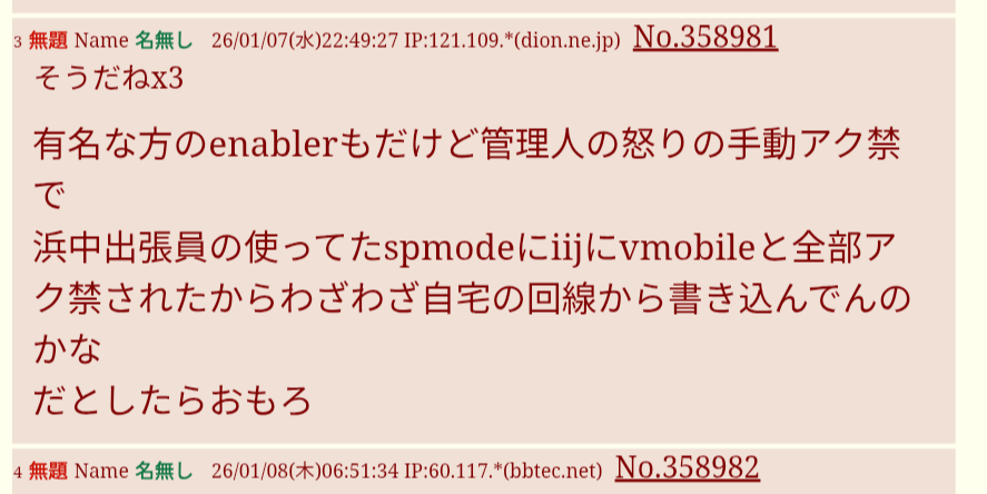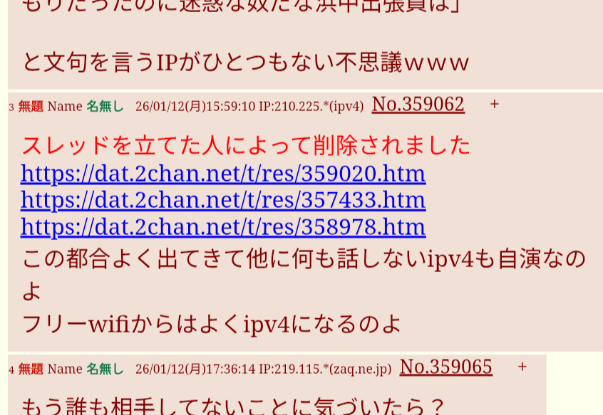 | … | 5無題Name名無し 26/01/13(火)00:27:40 IP:121.109.*(dion.ne.jp)No.359078+てかこのスレのスレ主もそのフリーwifiから書き込んでんじゃん |