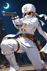 | … | 135無題Name名無し 26/02/25(水)04:31:39No.97303+ 1771961499665.jpg-(9212 B) weapon, gun, 1girl, large Brests,girl focus, dual wielding, sunglasses, solo, handgun, belt, holding, White pants, white long-sleeved shirt, white scarf, white turban, white cloth mask, sunglasses, white gloves, white boots、Crescent-shaped medallion on the forehead of the turban,, holding weapon, aiming, holding gun, white turban, covered mouth , |