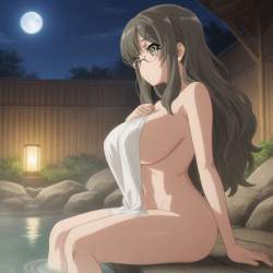 | … | 118無題Name名無し 26/04/27(月)06:47:31No.99692+ 1777240051423.jpg-(8267 B) huge breasts, completely nude body, holding small towel pressed against chest, towel draped over breasts suspended by volume creating gap beneath, bare waist, bare hips, bare thighs, bare back exposed, sitting at onsen, night with full moon, steam, lantern light |