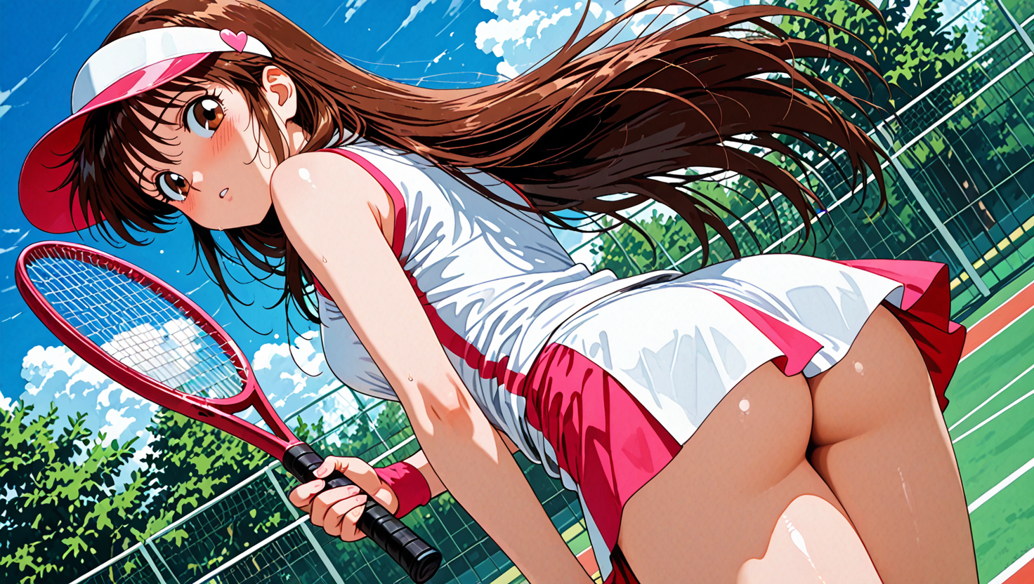 | … | 37無題Name名無し 25/12/07(日)04:42:22No.94582+ 1765050142262.png-(2784976 B) alternate costume, sportswear, tennis uniform, mini skirt, visor cap, tennis racket, ass peek, bottomless, low angle,ass shot,shy, looking back, shy pose,tennis court, fence,outdoors, sky, day, cloud, tree, |