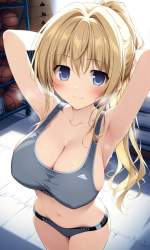 | … | 12無題Name名無し 26/03/08(日)03:25:43No.97736+ 1772907943304.jpg-(8076 B) 1girl, breasts, sweat, armpits, looking at viewer, mole, cleavage, large breasts, blush, arms up, long hair,sports bra, steaming body, grey sports bra, closed mouth, ponytail, smile, navel, collarbone, cowboy shot,midriff,arms behind head, sideboob,from above, gym storeroom, |