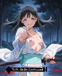 | … | 37無題Name名無し 26/03/09(月)04:37:59No.97777+ 1772998679394.jpg-(10919 B) White kimono, furisode, holding a Japanese sword in one hand, smiling, blood splatter, rain, wind, floating hair, fighting stance, night, in front of a row of cherry blossom trees in full bloom, pointing at viewer, wet,,(to be continued:1.3),nipples, |