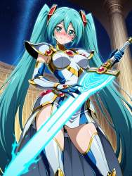| … | 77無題Name名無し 26/03/10(火)04:35:16No.97830+ 1773084916167.jpg-(13337 B) (alternate costume), No.39 Utopia (cosplay), Yu-Gi-Oh! ZEXAL, mecha girl, armored powered suit, white armor, intricate gold trim, futuristic king, large shoulder pads, glowing red eyes, sharp armor design, holding metallic sword, neon blue energy, glowing aura, armored twintails, |