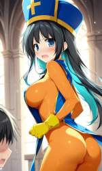 | … | 92無題Name名無し 26/03/10(火)21:28:02No.97855+ 1773145682506.jpg-(8923 B) 1girl, solo, breasts, cosplay, ass, bodysuit, tabard, open mouth, hat, black hair, gloves, orange bodysuit, blush, looking at viewer,blue tabard, v-shaped eyebrows, blue headwear, yellow gloves, mitre, cowboy shot, looking back, skin tight,embarrassed, sweatdrop, angry, standing, cross, from side, wavy mouth, sideboob, looking to the side, cross print, from behind, leaning forward, clenched hand,church |
