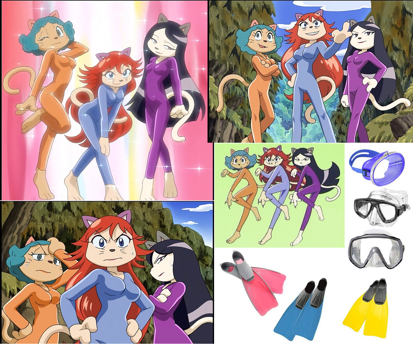 これらの猫耳少女キャラクターのうち1人または複数人が、ゴーグルとフィンを装着して水中を泳いでいる様子を描いてください。