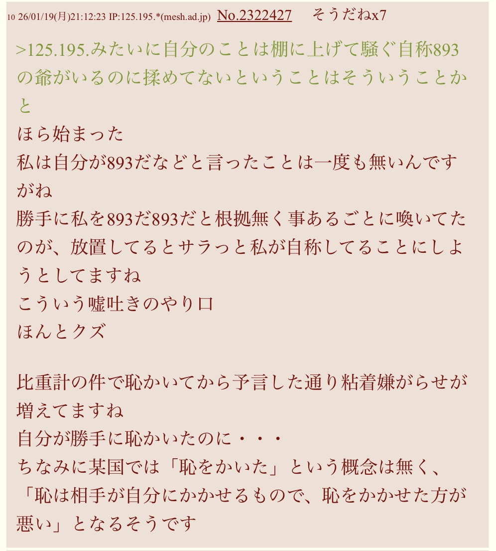 | … | 626/01/23(金)08:34:19 IP:61.211.*(starcat.ne.jp)No.2322906+ 1769124859151.jpg-(256500 B) 息をするように奇怪な嘘を吐く |