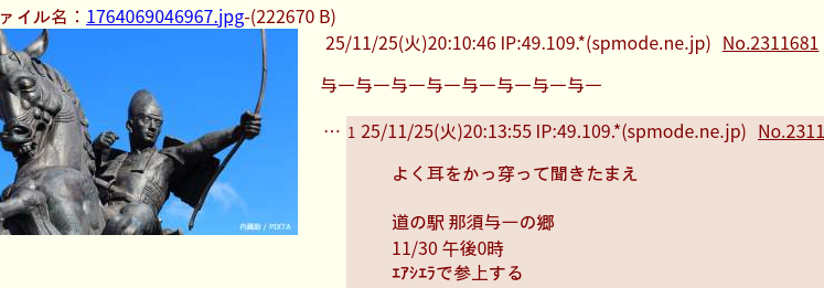 | … | 425/11/25(火)20:40:13 IP:219.102.*(nttpc.ne.jp)No.2311694+エアのシエラでね |