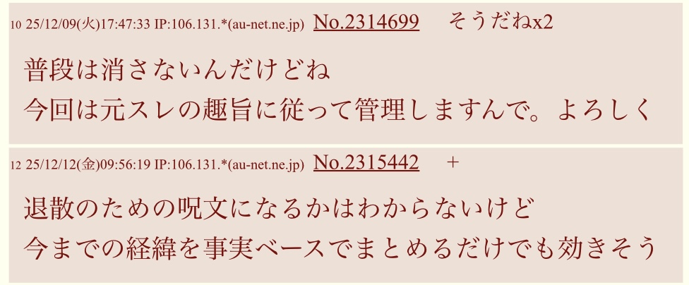 | … | 525/12/12(金)11:07:39 IP:14.9.*(enabler.ne.jp)No.2315459+逮捕されて書き込めなくなってもまーだココ読んでんだぜ |