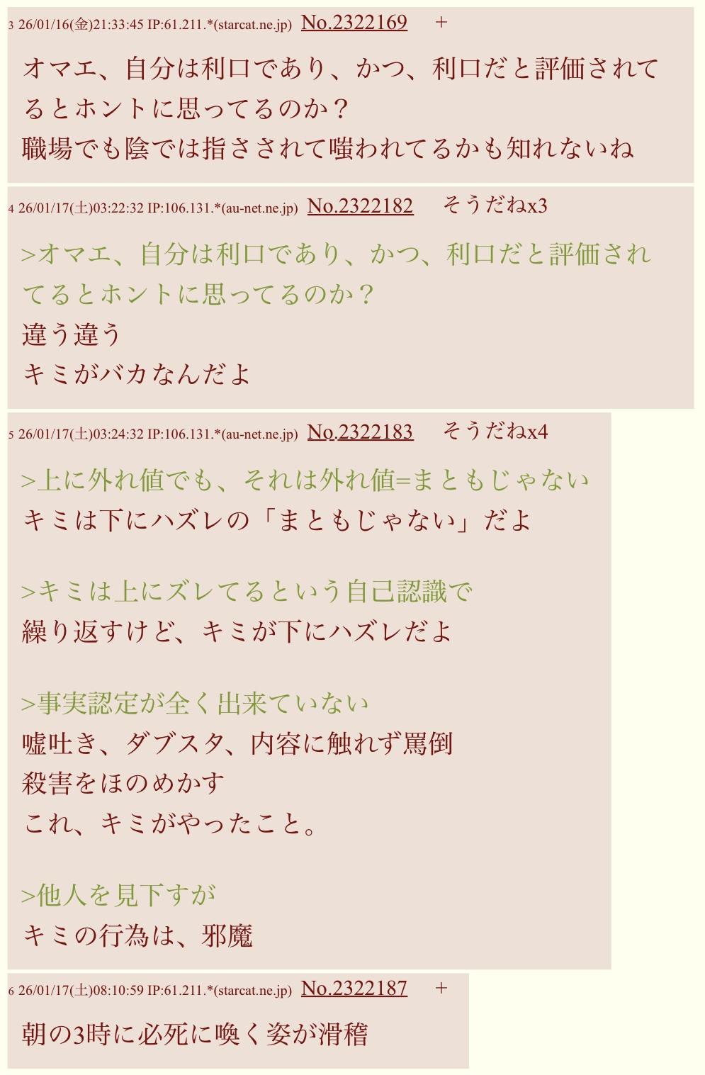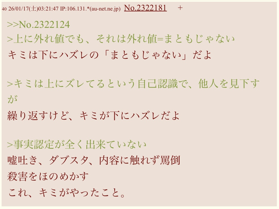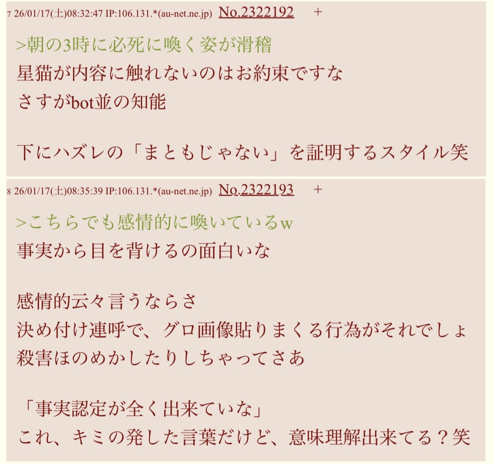 | … | 326/01/17(土)08:25:45 IP:61.211.*(starcat.ne.jp)No.2322191+ 1768605945676.jpg-(136425 B) こちらでも感情的に喚いているw |