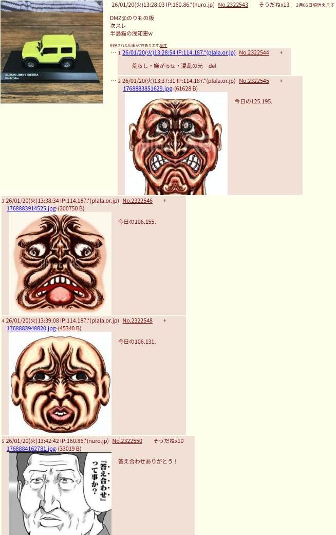 | … | 126/01/22(木)13:51:47 IP:114.187.*(plala.or.jp)No.2322808+荒らし・嫌がらせ・混乱の元 del |