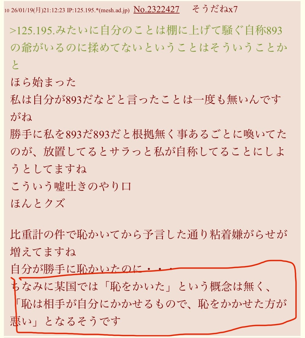 | … | 2026/01/23(金)09:00:22 IP:61.211.*(starcat.ne.jp)No.2322910+ 1769126422330.jpg-(1827224 B) てか、近所に125.195.に態度が似ていて、893を自称する土建屋の爺がいるということであって、125.195.が893自称してるとはどこにも書いてないんだが? |