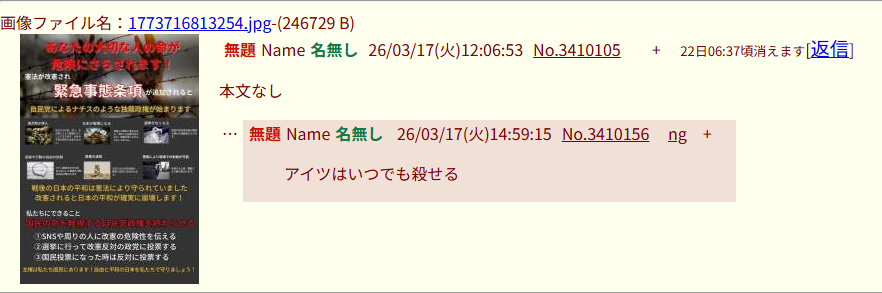 | … | 2無題Name名無し 26/03/17(火)19:46:13No.3410303+共産中国人と朝鮮人と韓国人と帰化人が違法な政治活動をしているな |