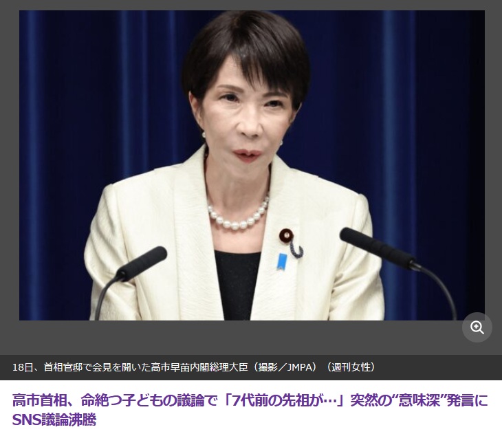 高市首相、命絶つ子どもの議論で「7代前の先祖が…」