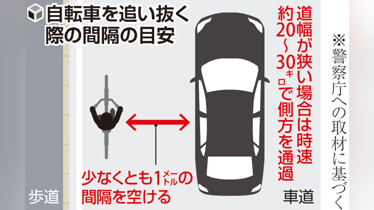 2026年4月1日より施行された改正道路交通法により、自動車が自転車を追い抜く際は、安全な間隔(目安1m以上)を空けるか、それができない場合は徐行(20〜30km/h以下)することが義務化されました。