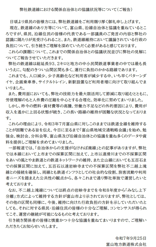… | 23無題Name名無し 25/10/01(水)01:24:05 IP:113.155.*(commufa.jp)No.897127そうだねx1>富山地鉄の言い分を(推測込みで)全面的に信用できるって君すごいな |