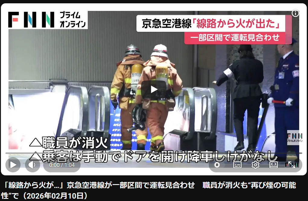 | … | 23無題Name名無し 26/02/10(火)15:27:49 IP:110.67.*(so-net.ne.jp)No.905317+ 1770704869349.png-(837057 B) 「線路から火が…」京急空港線が一部区間で運転見合わせ 職員が消火も“再び煙の可能性”で |
