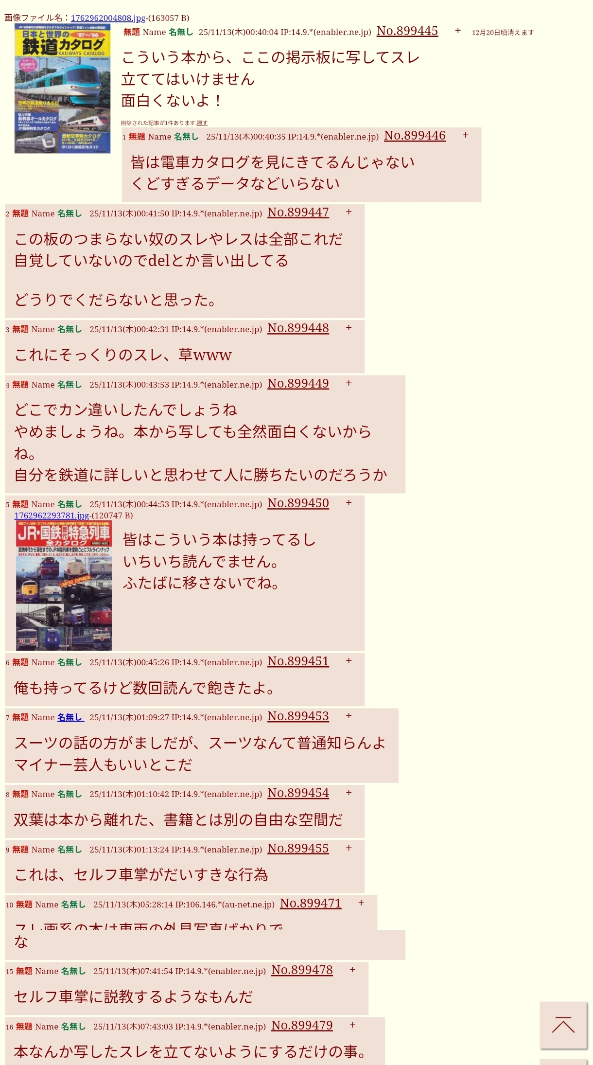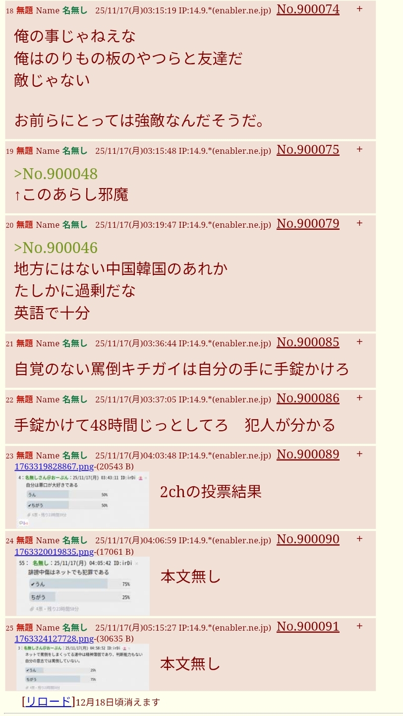 | … | 14無題Name名無し 25/11/13(木)09:07:51 IP:14.9.*(enabler.ne.jp)No.899512+スレッドを立てた人によって削除されました |