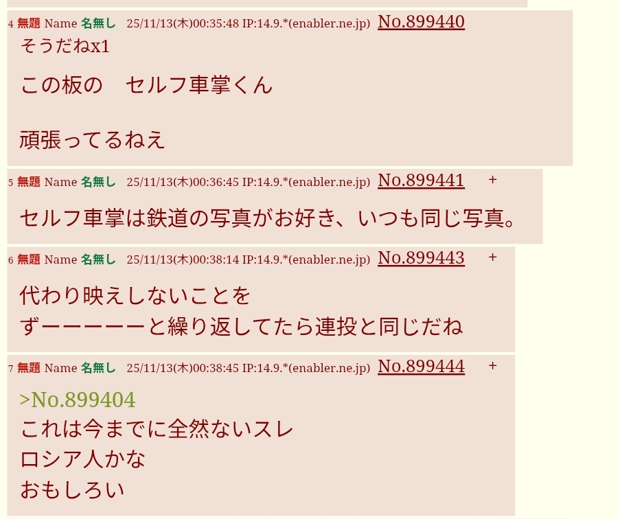 | … | 5無題Name名無し 25/11/13(木)08:48:13 IP:14.9.*(enabler.ne.jp)No.899501+スレッドを立てた人によって削除されました |