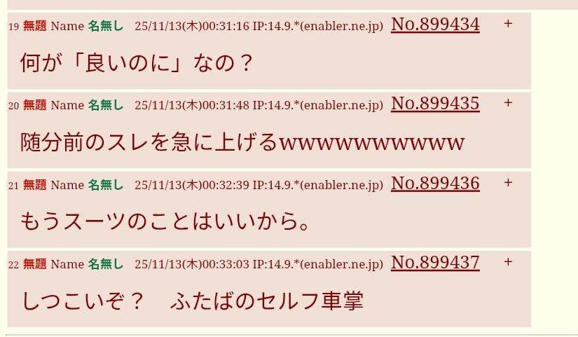 | … | 3無題Name名無し 25/11/13(木)08:37:55 IP:14.9.*(enabler.ne.jp)No.899493+スレッドを立てた人によって削除されました |
