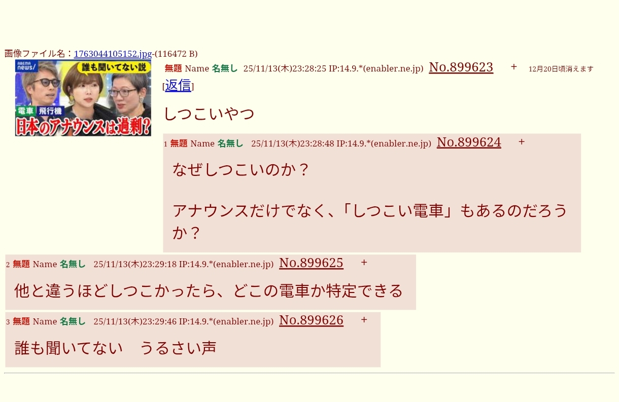 | … | 10無題Name名無し 25/11/13(木)08:58:06 IP:14.9.*(enabler.ne.jp)No.899508+書き込みをした人によって削除されました |
