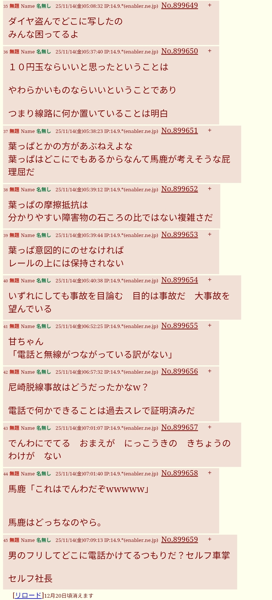 | … | 11無題Name名無し 25/11/13(木)08:58:49 IP:14.9.*(enabler.ne.jp)No.899509+スレッドを立てた人によって削除されました |