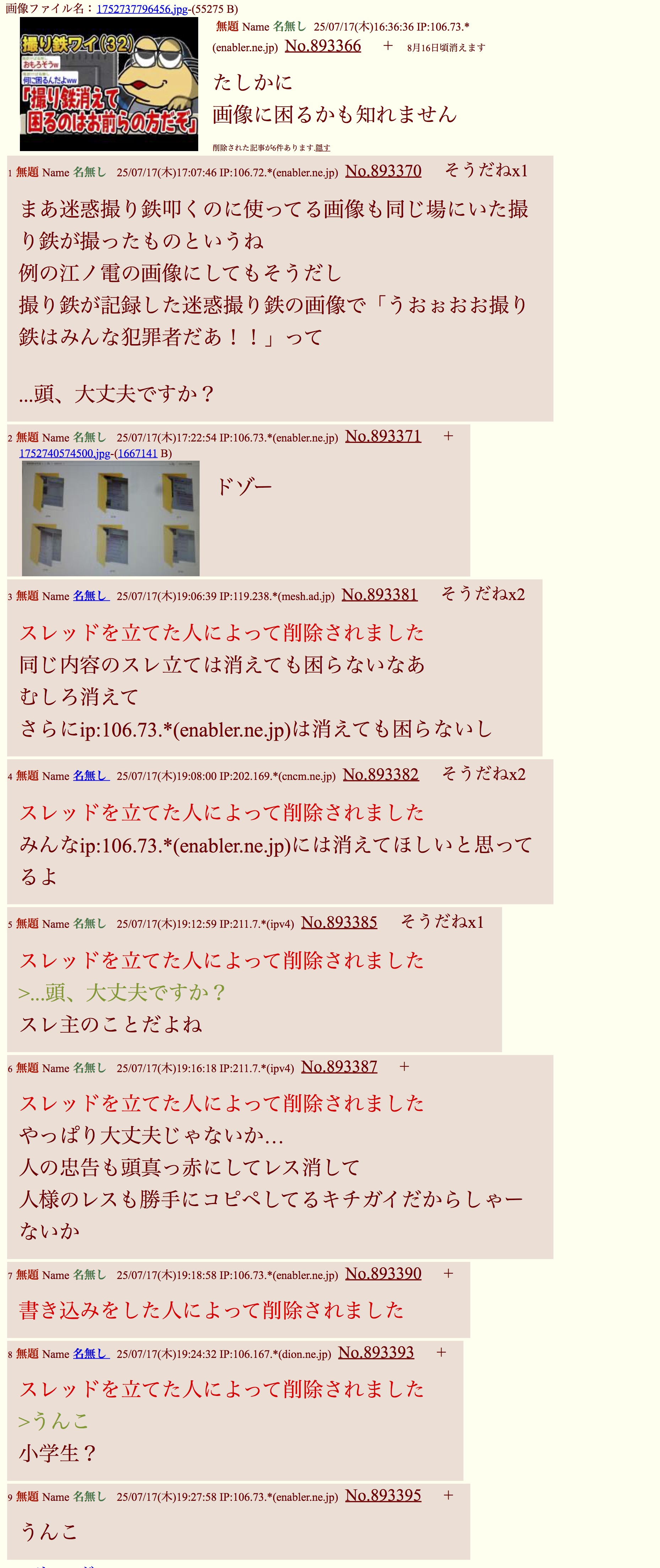 | … | 9無題Name名無し 25/11/13(木)08:55:50 IP:14.9.*(enabler.ne.jp)No.899507+スレッドを立てた人によって削除されました |