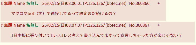 | … | 3無題Name名無し 26/02/27(金)22:51:28 IP:121.109.*(dion.ne.jp)No.361617+まじでbot一つ作れないの無能かよwww |