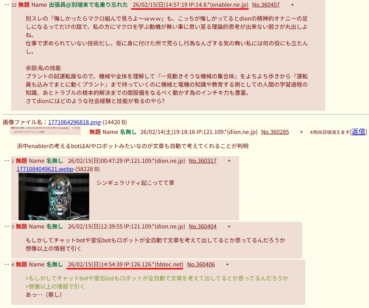 | … | 2無題Name名無し 26/02/27(金)22:48:22 IP:121.109.*(dion.ne.jp)No.361616+無職爺さんこいつさぁ、botもマクロも理解できないの馬鹿なんか?ww |