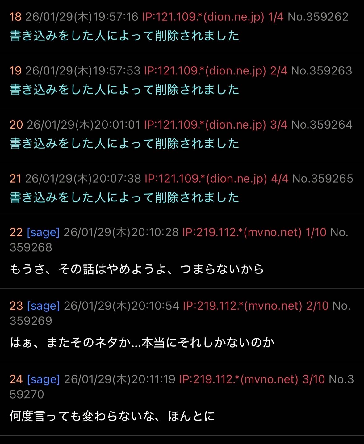 | … | 18無題Name名無し 26/02/04(水)00:11:35 IP:121.109.*(dion.ne.jp)No.359556+残念だったねw |