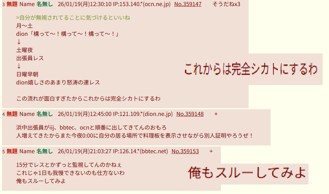 | … | 2無題Name名無し 26/01/20(火)22:20:18 IP:126.126.*(bbtec.net)No.359164そうだねx1ほーら出張員の副回線でちゅよー |