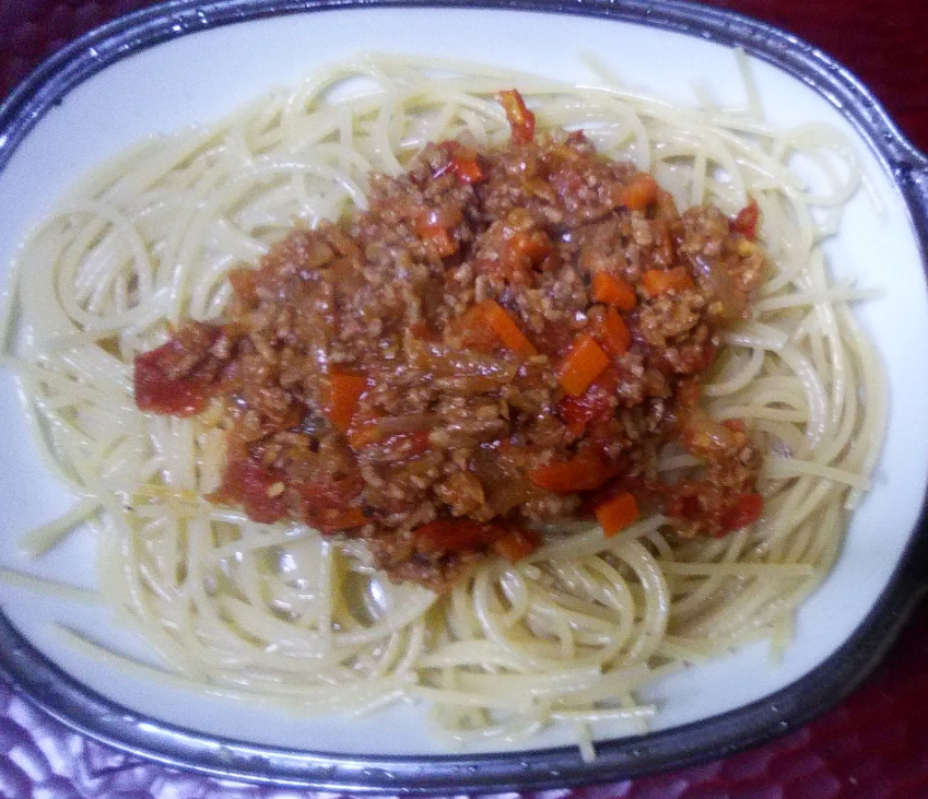 常温で放置してカビが生えたミニトマトと冷蔵庫で色がおかしくなったひき肉で作ったミートソーススパ